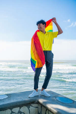 Young gay man proudly holding the lgbt flag in his hands in front of the sea