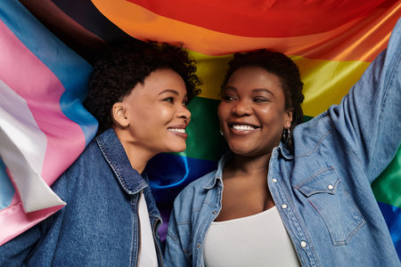 Two stylish women share a joyful moment together beneath a vibrant display of pride flags.