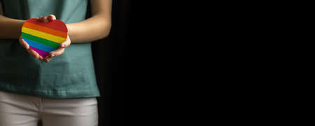LGBT flag in heart shape in woman hands isolated on black background banner with copy space