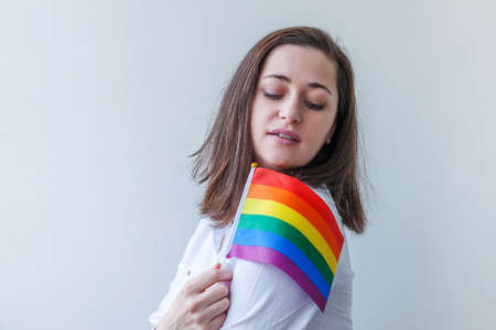 Beautiful caucasian lesbian girl with LGBT rainbow flag isolated on white background looking happy and excited. Young woman Gay Pride portrait. Equal rights for lgbtq community concept