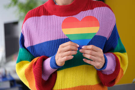 Female arms holding the heart coloured in LGBT pride colours on the dark background. Concept of the International Day Against Homophobia concept, sexual equality, feminism, social safety and protection