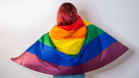 Non-binary person, back turned, arms outstretched, holding gay pride flag. Non-binary concept, lgbtq +, inclusion, gay, lesbian, lgbtq.