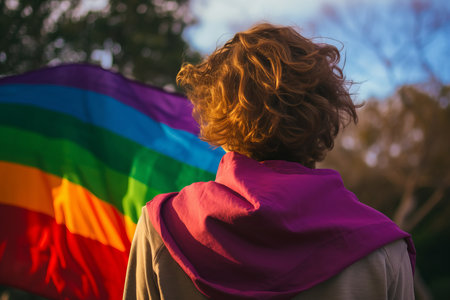 A strong and proud woman holds high the vibrant rainbow LGBT flag against a beautiful outdoor backdrop. This empowering image represents love, diversity, and equality, making it ideal for LGBTQ+ pride events, social justice campaigns, and inclusive projects