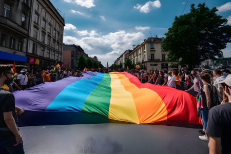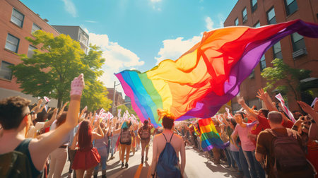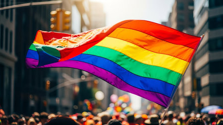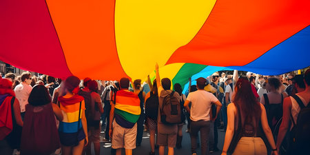 A big rainbow flag of the LGBT community in the city on parade, pride month, Generative AI content