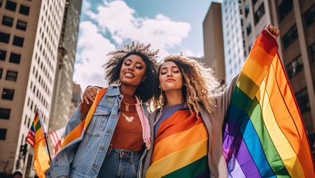 Diversity young gay women waving pride rainbow flag in their backs supporting LGBTQ pride in the park. Independence and polygamy. Supporters of the LGBT community. AI generated.