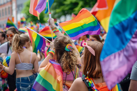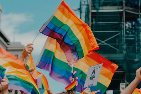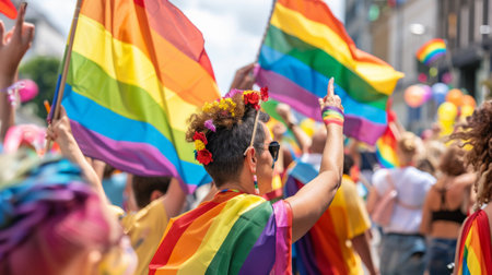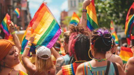 A lively scene from a pride parade showcasing a vibrant crowd holding colorful flags, celebrating diversity and unity in support of LGBTQ rights and identity.