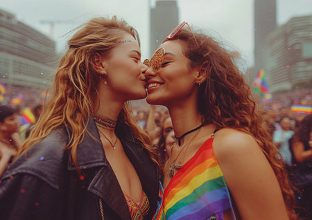 Young happy lesbian couple kissing on LGBTQ party on the street.AI Generative.