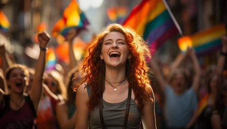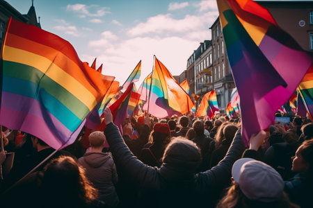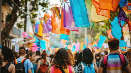 Peaceful demonstration in support of LGBTQ rights, with colorful flags waving. Participants sharing messages of love and acceptance. Crowd of people demanding equality. Generative AI