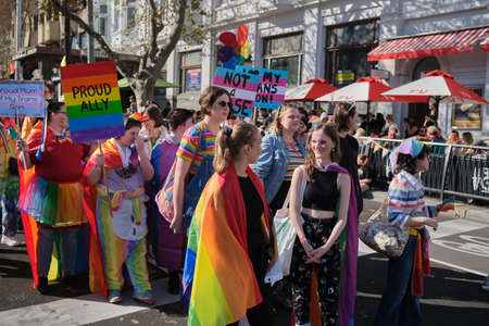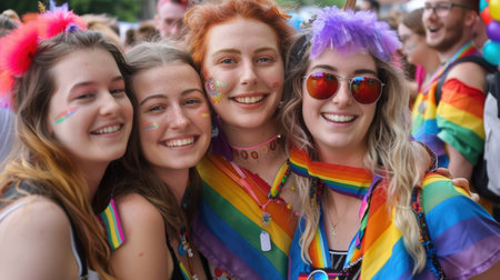 A group of women standing next to each other. Young vibrant people in rainbow clothes on a pride event.