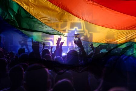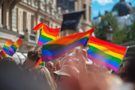 Gay pride, LGBTQ rainbow flags being waved in the air at a pride event