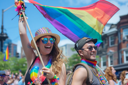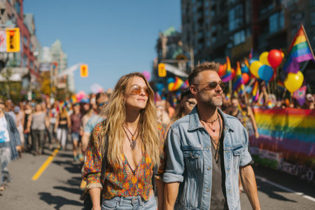 A Couple walking confidently during pride month parade with vibrant rainbow flags and balloons in lively urban setting