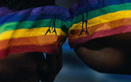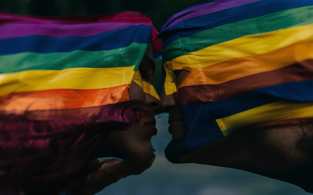 Diversity young gay women gay waving pride rainbow flag in their backs supporting LGBTQ pride in the park. Independence and polygamy. Supporters of the LGBT community. AI generated.