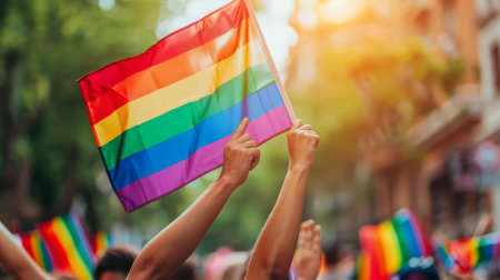 Pride community at a parade with hands raised and the LGBT flag - symbol of love and tolerance. LGBT community, happiness, freedom and love concept for same sex couples.