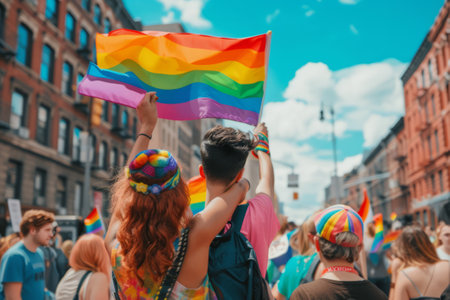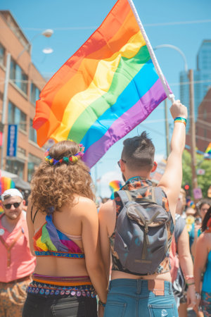 A couple raising a rainbow flag high at a pride march, joyfully celebrating their identity and love.