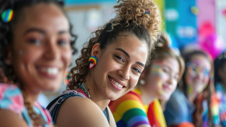 This heartwarming image showcases a diverse group of teachers celebrating Pride Month in their classroom promoting inclusivity and acceptance