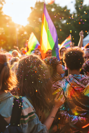 A lively scene capturing a pride celebration in the city, featuring colorful confetti raining down as participants wave rainbow flags with joy and unity.