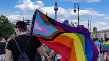 Berlin, Germany - June 26, 2021 - A man with the traditional rainbow flag on Christopher Street Day in Berlin, Germany