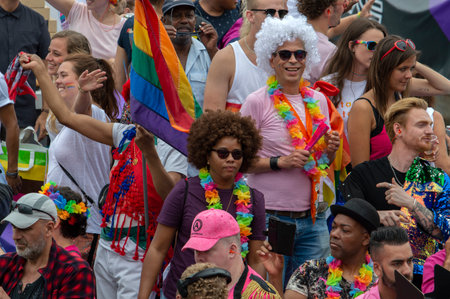 LONDON, UNITED KINGDOM - Jul 06, 2019: United Kingdom, July 2019, London. Participants gather for the London Gay Pride Parade 2019, descending the busy Regent Street.