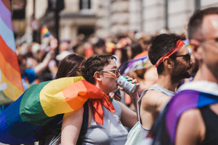 London / UK - 02/07/2022: People with flags and banners celebrating London LGBTQ Pride Parade