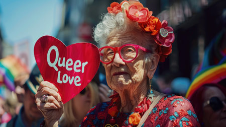 Elderly woman supporting LGBTQ+ rights holding heart-shaped sign at pride event