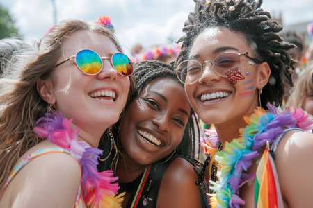 Three friends share a joyful embrace, their faces adorned with pride colors and glitter, radiating happiness at a Pride celebration. Generative AI.
