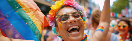 A woman is smiling and holding a rainbow flag. She is wearing a flower crown and sunglasses. Concept of joy and celebration, likely related to a pride parade or a similar event