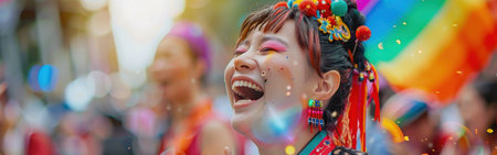 Celebrate in pride month festival. Pride movement transgender asian couple lesbian LGBT holding rainbow flag for freedom. Gatherings of friends in parade communities celebrating LGBTQ+ causes.