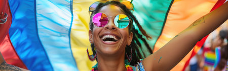 A woman is holding a rainbow flag and smiling. She is wearing sunglasses and has a colorful outfit. Concept of joy and celebration, as the woman is participating in a rainbow pride event or festival