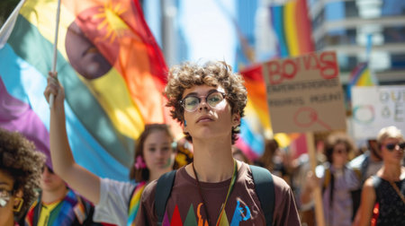 Young man proudly waving rainbow flag in the midst of diverse crowd at gay pride parade