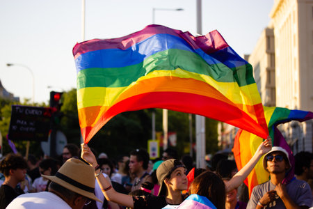 Madrid, Spain. July 3, 2022 Lots of young people in crowd carrying rainbow LGBT flags on procession, marches. Youth have fun at Pride month, LGBTQ gay parade 2022. Summer Festival joy celebrating.