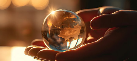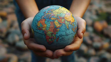 A vibrant globe held in a hand symbolizes global awareness and commitment to protecting the environment, showcasing the beauty of our planet.