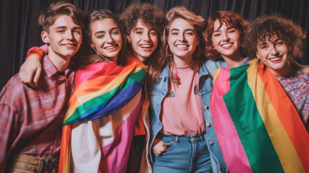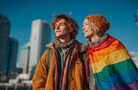 A young couple poses joyfully in a studio, embracing each other with smiles. The female has a stylish haircut, while the male wraps a rainbow flag around himself, celebrating love and unity.