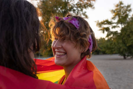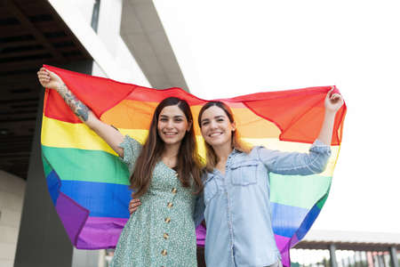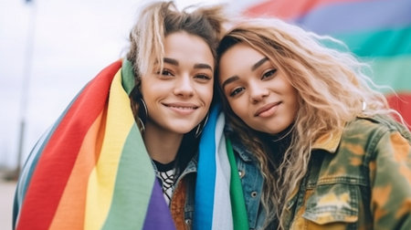 Two good-looking young gay women standing with a gay pride rainbow flag in their backs supporting LGBT pride