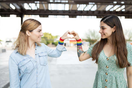 Beautiful caucasian woman and a pretty hispanic women making a heart with their hands together