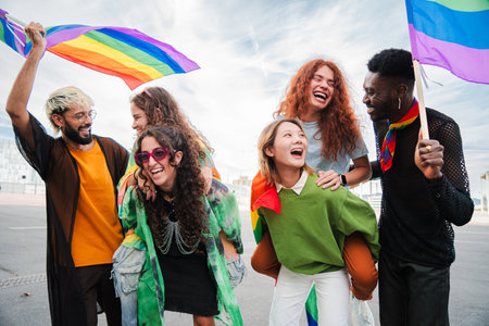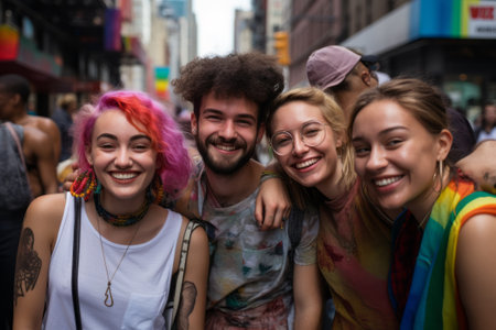 Generative AI : Diverse group of young people celebrating gay pride festival day Lgbt community concept with guys and girls hugging together outdoors Multiracial trendy friends s