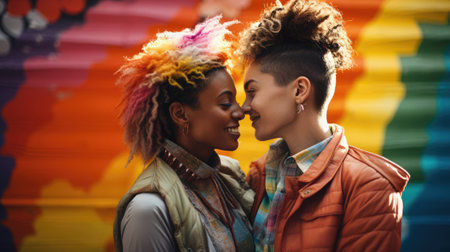 Lesbians kissing close-up in rainbow flag background. Generative AI