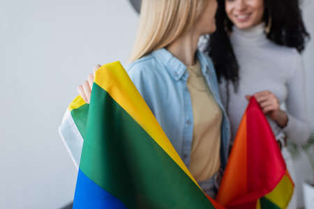 cropped view of blurred interracial same sex couple holding lgbt flag