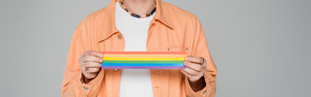 Cropped view of stylish gay man holding lgbt flag isolated on grey, banner