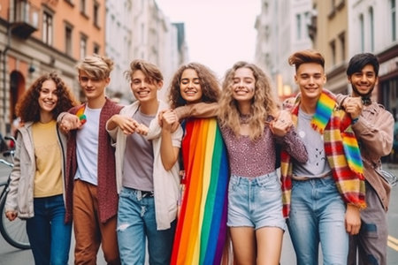 a varied group of young LGBT activists waving a rainbow flag and representing the gay and lesbian community