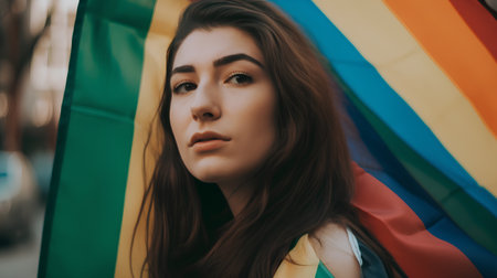A young woman stands confidently in an urban setting, draped in a rainbow flag. Her vibrant expression and tattoo symbolize pride and diversity in a contemporary world.
