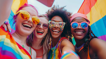 Exuberant friends at Pride parade, selfie with rainbow flags, embodying the vibrant spirit of LGBTQ community