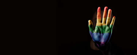 closeup of a person with their hand patterned with the rainbow pride flag in front of their face, on a black background, in a panoramic format to use as web banner or header