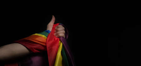 LGBTQ pride flag. Lesbian Gay Bi sexsual Transgender Queer. Homosexsual pride Rainbow flag in gay hand. black background. Represent symbol of freedom, peace, equality and love. LGBTQ concept.