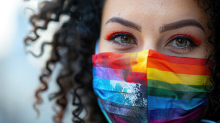 Close-up of woman with colorful eye makeup wearing rainbow face mask