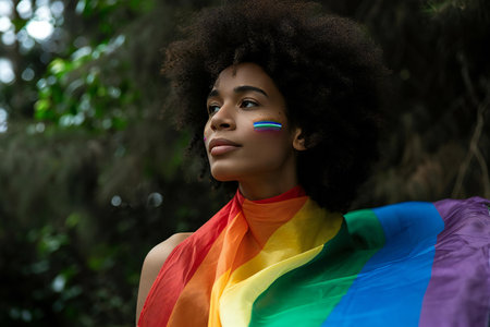 Beautiful african american woman with curly hair and rainbow flag posing outdoors