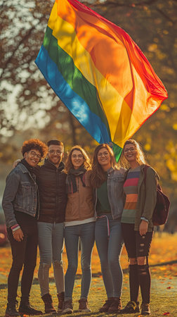 a diverse group of people holding a rainbow flag, outdoor. Lgbtq concept, horizontal photography with soft focus edges, subtle grain