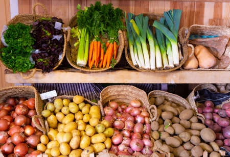 Beet and onion in shop. Colorful raw vegetables sold on grocery market. Natural organic veggies at supermarket. Vegetarian healthy nutrition
