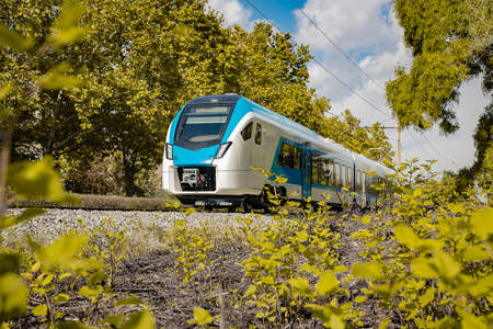 Modern and new passenger commuter Train in white and blue color is traveling on a single track railway line between the green leaves on an autumn day.