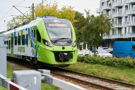 Kolobrzeg, Poland – September 11, 2021: Regional train to Szczecin at a railroad barrier in the center of Kolobrzeg in Poland