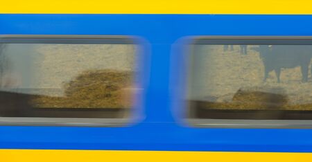 A high-speed bullet train rushing through a rural landscape, symbolizing progress and speed, shot at dusk, using a long exposure, with a herd of deer crossing the tracks